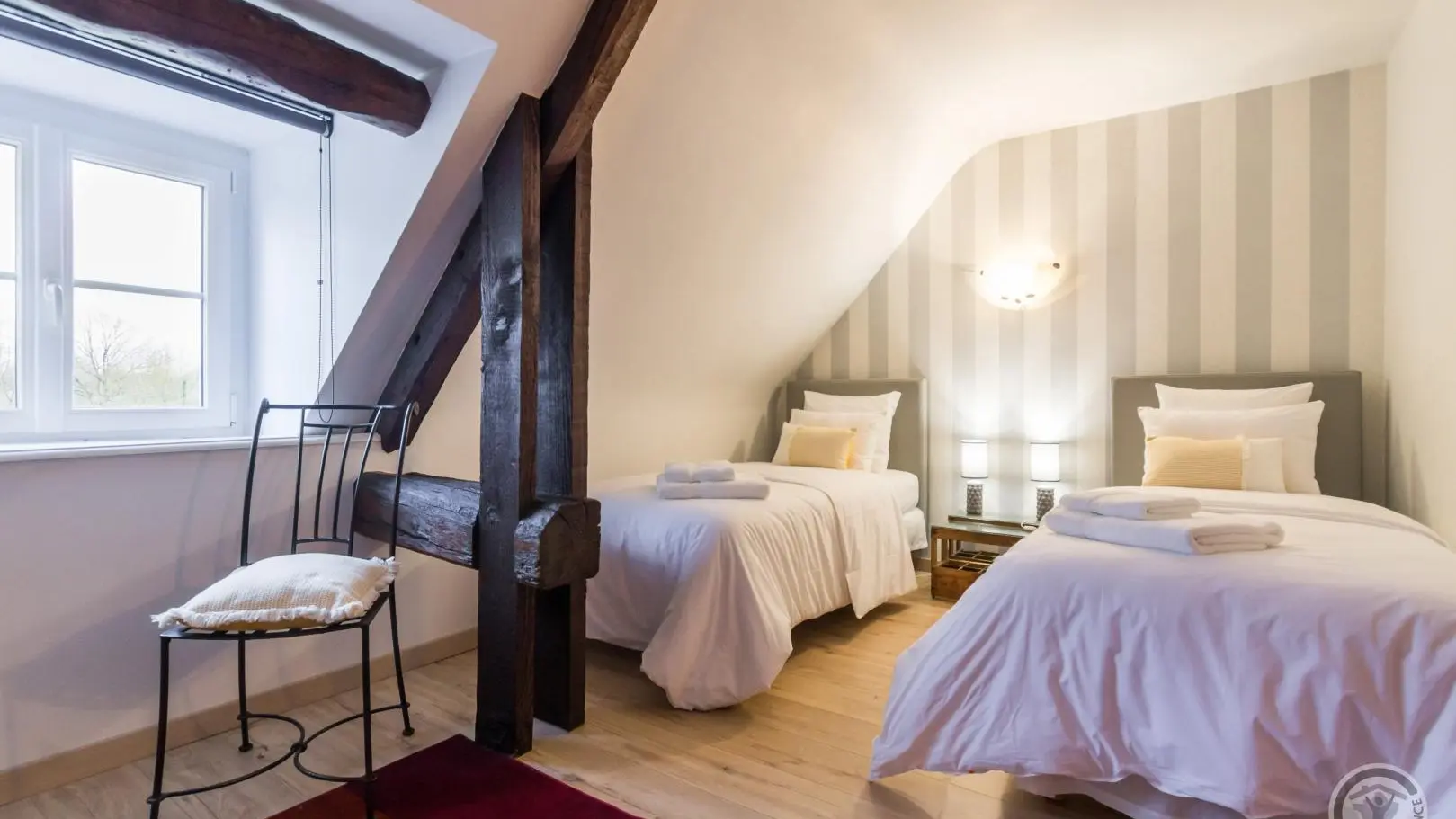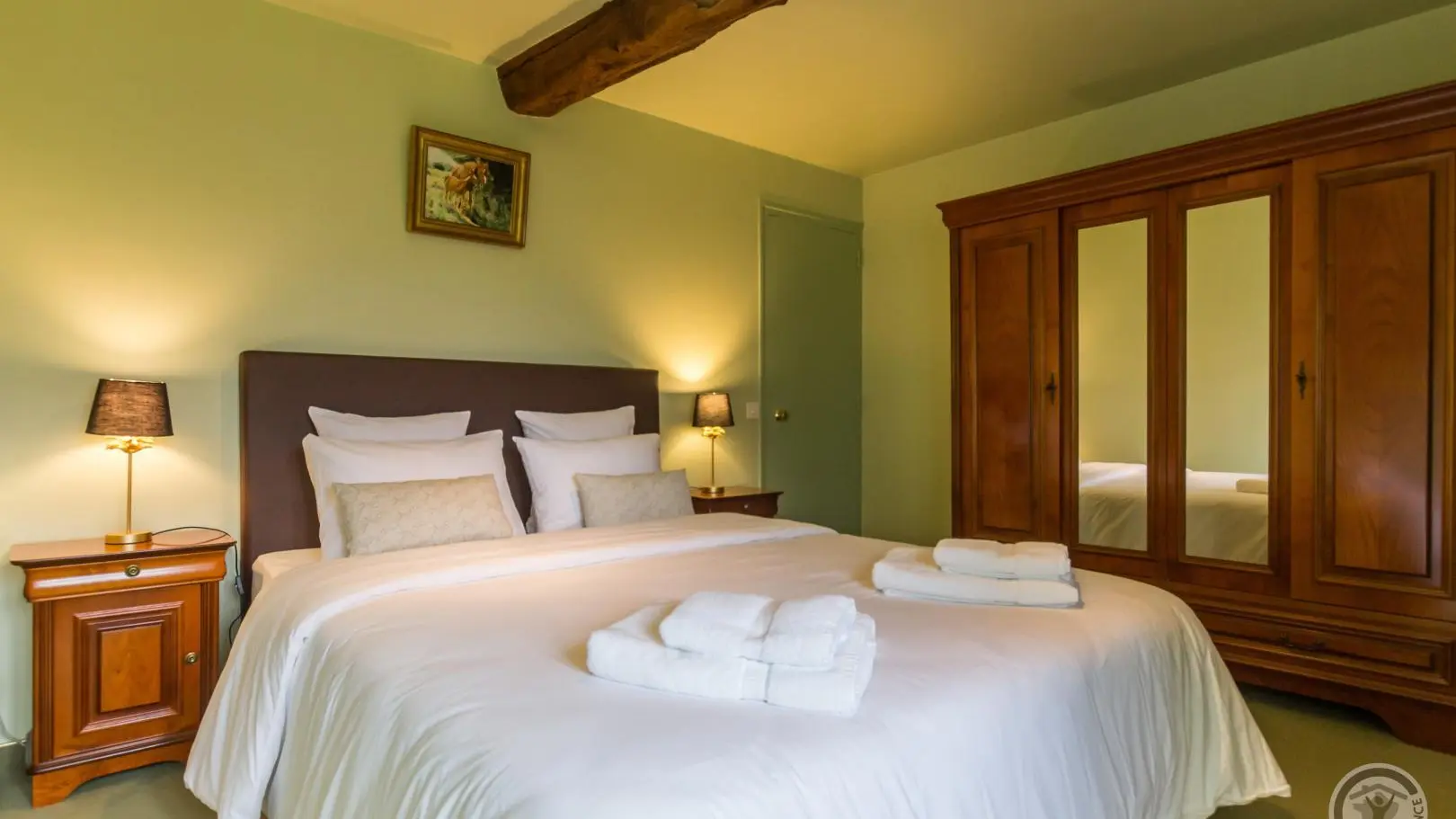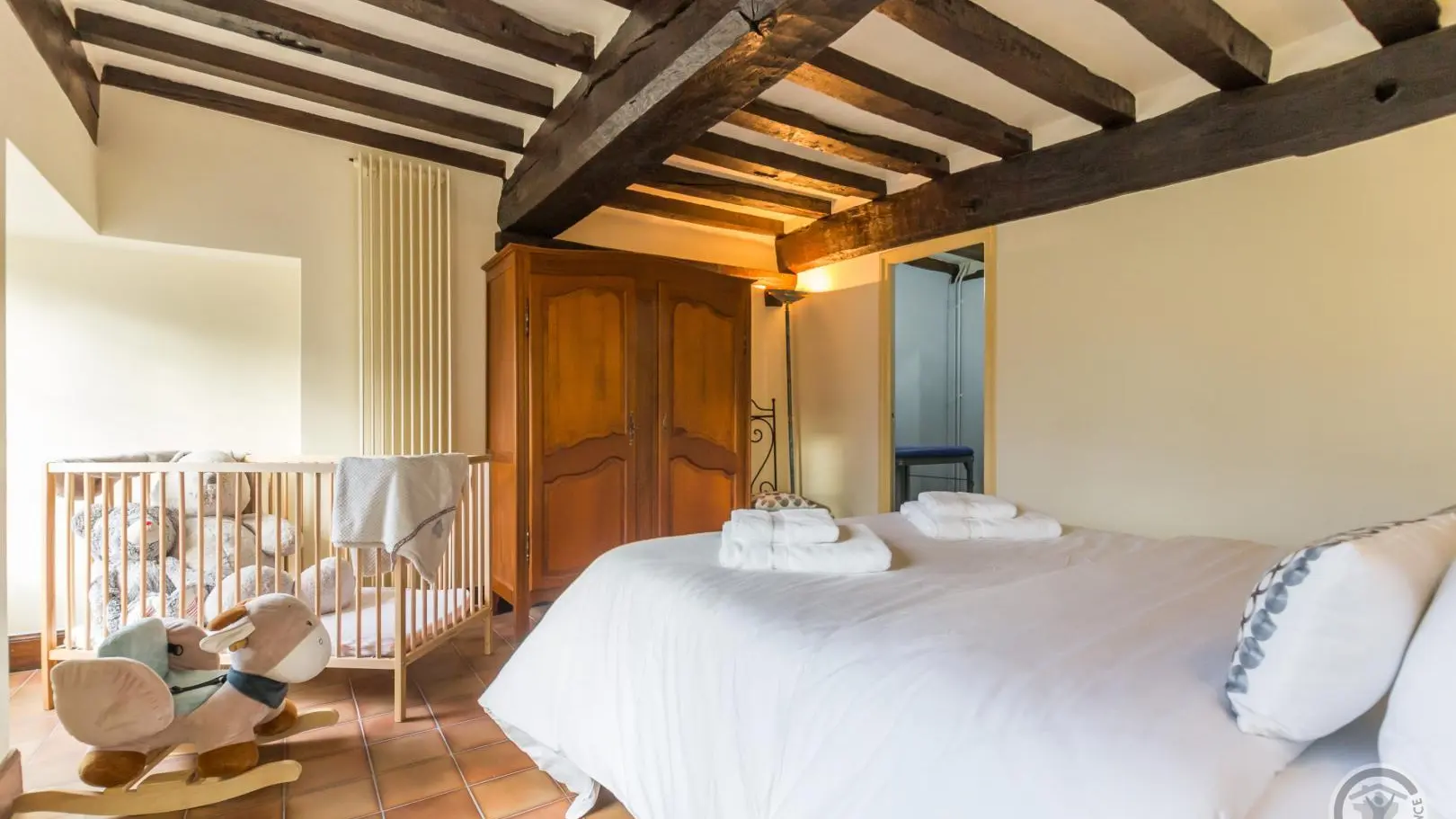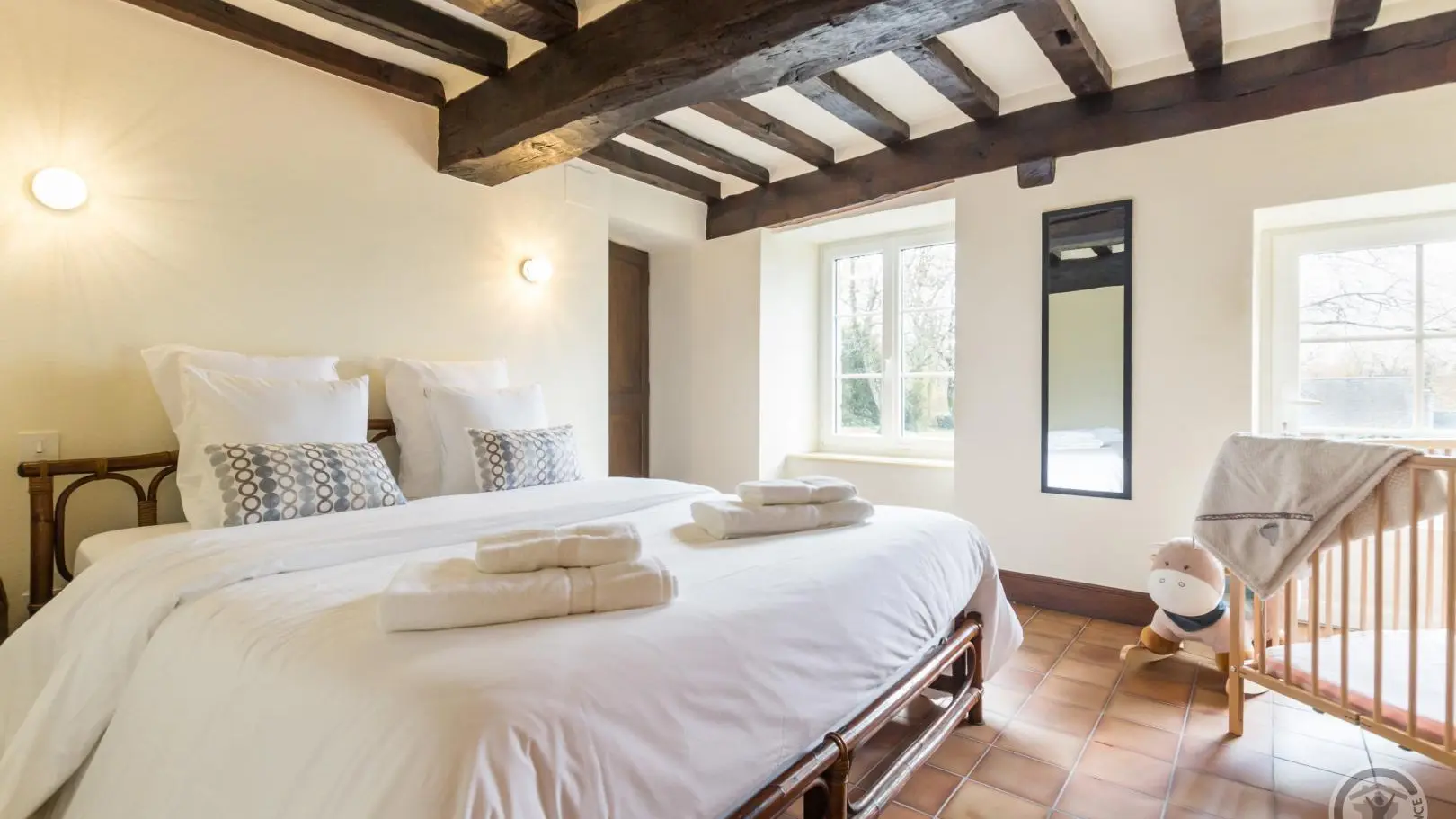 The path leading down to Le Rochelu gradually plunges you into the greenery. Chestnut trees greet you, and your mind wanders off into this unspoilt environment. Caroline warmly welcomes you to this authentic family home, which sleeps up to 12. Everything is perfectly arranged for your comfort and well-being. Families in particular will enjoy happy days here, barely disturbed by birdsong or the whisper of wind in the trees. With a little patience, you'll catch a glimpse of the rich wildlife of our countryside (squirrels, hedgehogs, roe deer...). With its monumental fireplace, the beautiful living room is at the heart of the house and will be the place for your convivial evenings. But when the weather's nice, the old awning and its magnificent granite wine press provide a superb backdrop for aperitifs in the blue hour. An old-fashioned charm floats through the 154m² of this longère, enveloping us in a very comforting atmosphere.